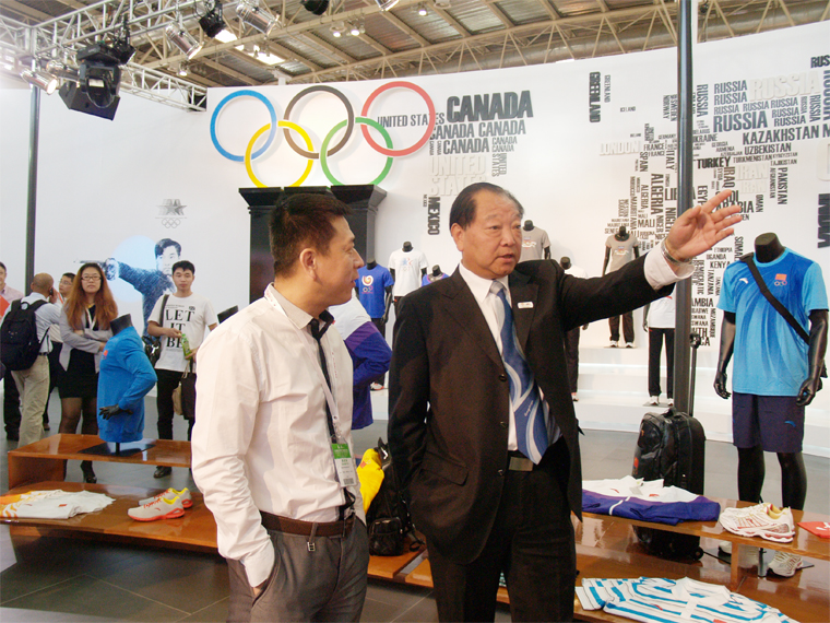 其間,德展國際集團董事長馮玉彬先生與安踏集團首席執(zhí)行官丁志忠及奧運冠軍、現(xiàn)國家體育總局自行車擊劍運動管理中心副主任許海峰親切交談并在展位前合影留念。
