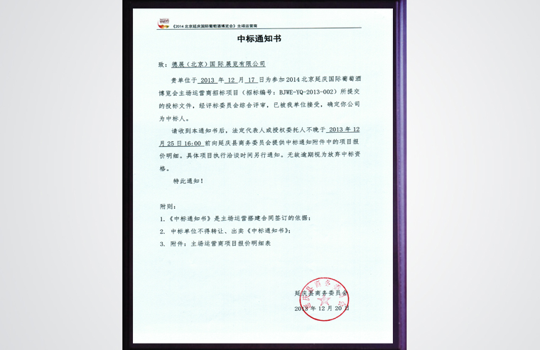 2013年12月17日,我公司參加了2014北京延慶國際葡萄酒博覽會主場運營招標(biāo)項目(招標(biāo)編號:BJWE-YQ-2013-002),共有8家企業(yè)一起競標(biāo),2013年12月20日下午,喜訊傳來,我們收到了延慶縣商務(wù)委員會的中標(biāo)通知書,大家都為之振奮,再一次證明了團隊的力量是戰(zhàn)無不勝的。12月25日,延慶縣商務(wù)委員會相關(guān)領(lǐng)導(dǎo)一行5人到我集團北京本部工廠蒞臨考察。