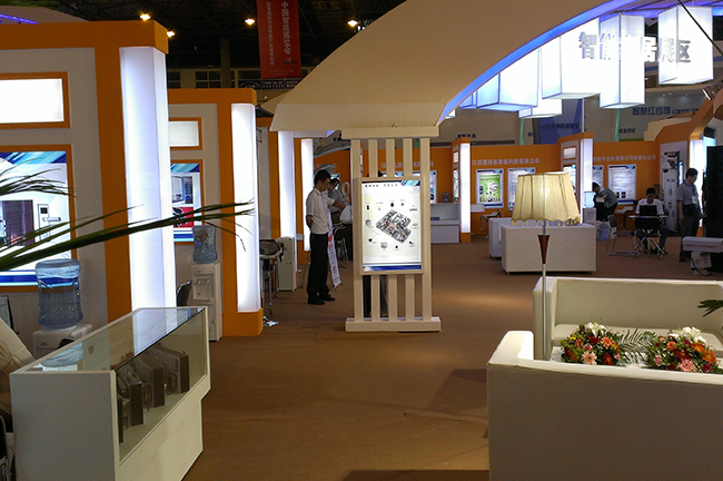 8月15日,由中國人工智能學會、南昌市人民政府、江西省工業和信息化委員會、中航航空裝備有限責任公司共同主辦的2014中國智能博覽會在南昌市國際展覽中心隆重開幕。德展集團設計承建的南昌市政府展臺無疑成為展會最亮麗的一道風景線,可以用三最來形容,面積最大、設計最科技時尚、現場駐足觀眾最多。