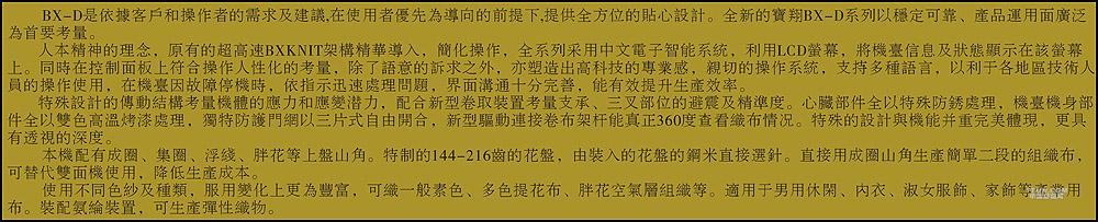 您所在的位置:紡機網(wǎng) > 產(chǎn)品庫 > BX-D-GJ雙面花盤提花針織圓緯機
