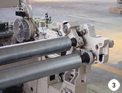 噴氣織機在引布時,雙壓布輥升降機構可方便地將上、下壓輥同時抬起,與卷布輥產生縫隙將布引出,省去很多人力和時間,安全可靠。