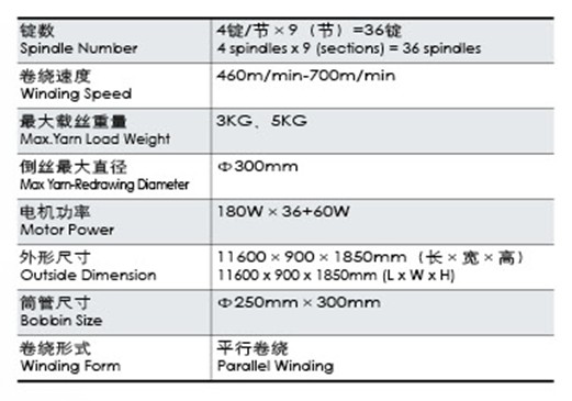 本機是化纖捻機的后道設(shè),把倍捻機上的卷取筒子倒成大卷裝,與無梭織機配套以減少停機時間,提高功效。