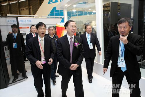 工業和信息化部副部長蘇波(前排中)在臺達集團創辦人暨董事長鄭崇華先生(右2)的陪同下參訪臺達展位