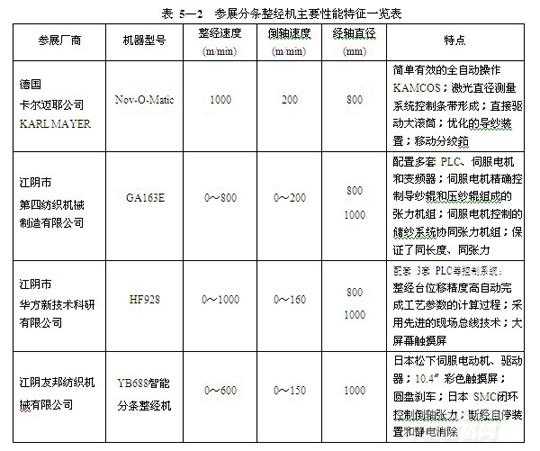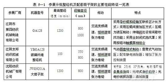 本屆展覽會實物參展的分批整經機有江陰四紡機 和江陰市江陰友邦紡織機械有限公司 整經機頭各1臺、沈陽紡織機械廠有限公司 大筒子架1臺。其他均以樣本的形式展出,產品型號與上屆基本相同,技術上變化不大。實物參展分批整經機的主要技術參數及其特點見表 5—1。