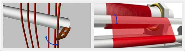 所有不同功能的分絞棒都裝置在可橫移的固定座上,該座由伺服控制和繞紗環的橫移同步,確保分絞鉤定位在正確位置進行分絞動作。